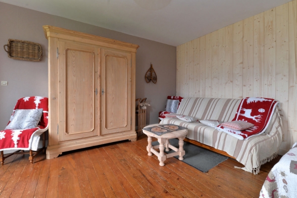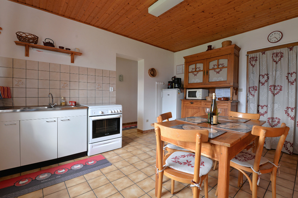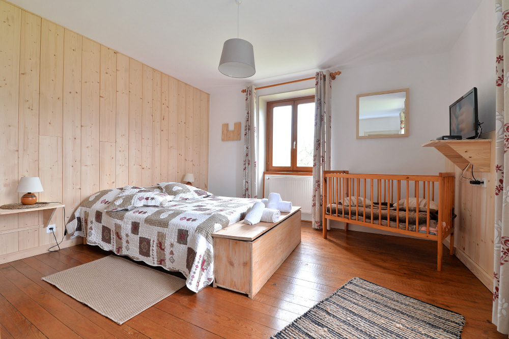 Le gîte Cerise (65m2) se situe au premier étage. Il offre une magnifique vue panoramique sur la vallée. Fraîchement rénovée tout en conservant l’esprit typique de la maison, c’est un véritable cocon. Vous y trouverez une cuisine équipée, une salle de bain, des toilettes, une grande chambre avec deux lits enfants, et une chambre adulte.